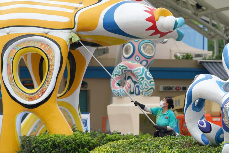 清潔工正在海洋公園門口清洗雕塑,為重開做好準備\中新社