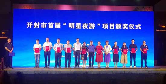 開封市領導向獲得開封市首屆「明星夜遊」項目榮譽的十家單位頒發了獎牌和證書。「明星夜遊」項目評選是開封市文廣旅局、開封市財政局為貫徹開封市「文旅30條」,加快發展夜間經濟在全省率先推出的一項創新舉措,每2年評定一次。今年評選出的開封清明上河園「夜遊清園」、夜遊萬歲山、大宋御河夜遊等十大明星夜遊項目,代表了開封市近兩年夜間文旅經濟的發展水平,在今年7月召開的開封市文旅大會上,每個項目獲獎勵10萬元。