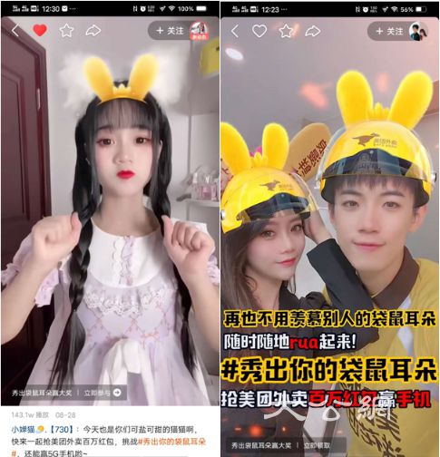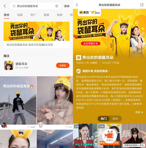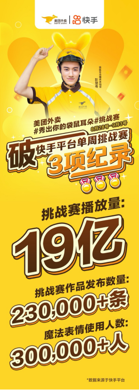 8月28日至9月3日期間,快手用戶通過定制「袋鼠耳朵」魔法表情拍攝短視頻,帶上#秀出你的袋鼠耳朵#話題進行發布,參與活動。一時間,萌趣可愛的美團外賣「袋鼠耳朵」俘獲無數快手老鐵的心,大幅度提升了美團外賣的品牌口碑和外賣小哥的正面形象。