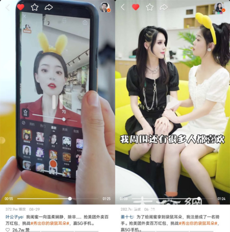 當然,快手也為美團外賣#秀出你的袋鼠耳朵#品牌挑戰賽提供了多種流量加持。在公域流量方面,活動通過開屏、信息流等多個資源位置對活動進行強視覺曝光,引導用戶參與活動,最大限度進行入口覆蓋,為活動升溫。私域流量層面,@葉公子、@姜十七、@小嬋貓等多位快手達人發布「秀出你的袋鼠耳朵」挑戰賽視頻,引爆活動制造聲量。最終活動得到了快手老鐵們的高度參與,使美團外賣本次營銷效果得到了高效轉化。