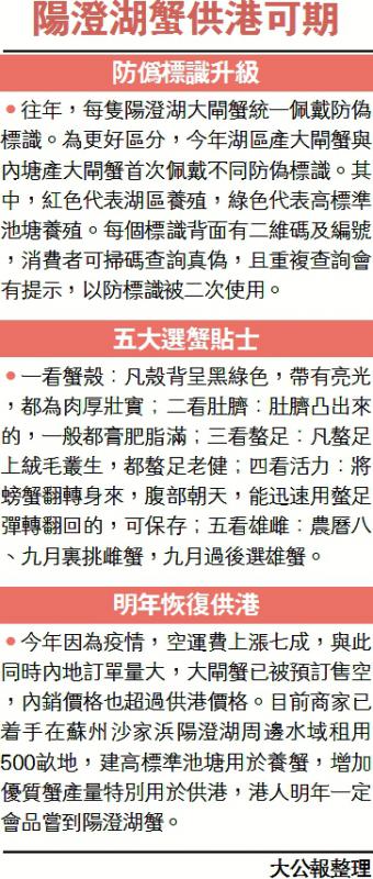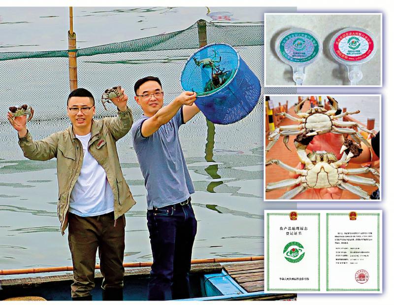 今年4月,「陽澄湖大閘蟹」獲國家農業農村部農產品地理標誌頒證,自此陽澄湖沿岸高標準池塘養殖區域的大閘蟹都屬於「陽澄湖大閘蟹」,當地通過種草投螺等生態措施保持產品質量,並針對池塘產和湖區產蟹分別推出紅色和綠色全新防偽標識。