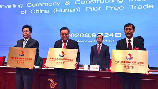 揭牌儀式現場,杜家毫、許達哲、湖南省委副書記烏蘭還分別為「中國(湖南)自由貿易試驗區長沙片區、郴州片區、岳陽片區」授牌。