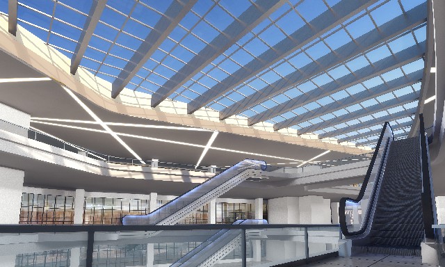 該項目設計採用「一體兩翼」的整體結構和空間布局。「一體」為貫穿項目與新疆大劇院的中軸核心空間。「東翼」為毗鄰兵團新區環湖路的城市功能組團,主要由城市航站樓、新疆風情VR體驗館、新疆特產巴扎、文創展廳、國際免稅店、休閑美食街等組成。