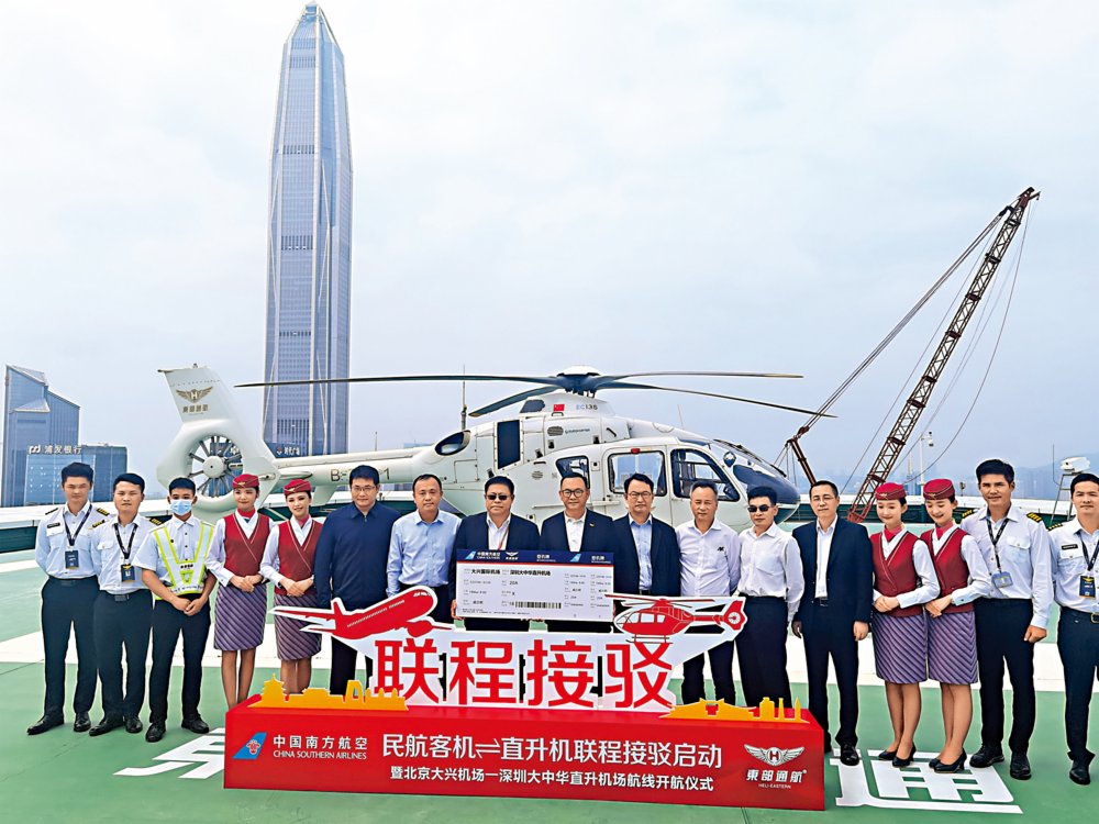 據大公報綜合報道:內地首條「民航客運+直升機」一站式聯運「空中的士」開行,10分鐘無縫換乘機場與市中心。3月18日,由南方航空與東部通航聯合推出的北京大興機場─深圳大中華直升機場接駁航線正式開航,乘客從北京抵達深圳機場後,專車接駁換乘直升機最快10分鐘即可抵達福田CBD。