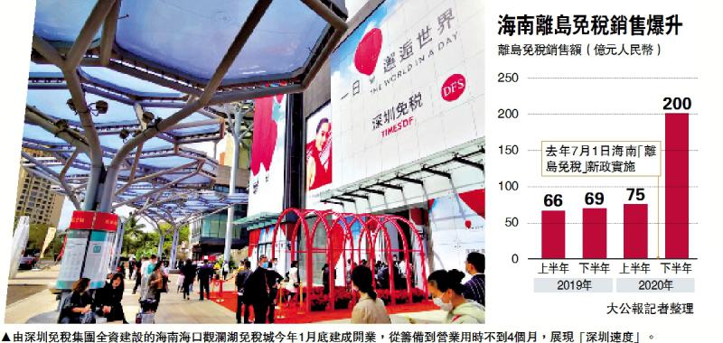 隨着中國內地經濟發展水平提高、居民收入增長,加上新冠肺炎疫情窒礙出遊,使得中國免稅零售市場持續升溫,有學者更預計今年內地潛在的兩萬多億元(人民幣,下同)境外消費中,有高達一萬多億元可望回流境內市場。