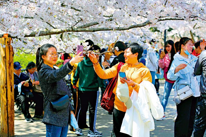 4月5日,遊客在青島市中山公園櫻花花海中自拍留念。\中新社