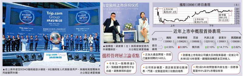 網上旅遊服務平台攜程(09961)首日上市,由於該股美市股價近期造好,帶動港股表現。該股昨日收報280.2元,較發行價高出12.2元或4.55%,不計手續費,每手賺610元。公司主席梁建章表示,內地、澳門市場已恢復至正常水平,預期五一長假期間,行業較2019年增長逾兩成,而攜程的增速料更快。