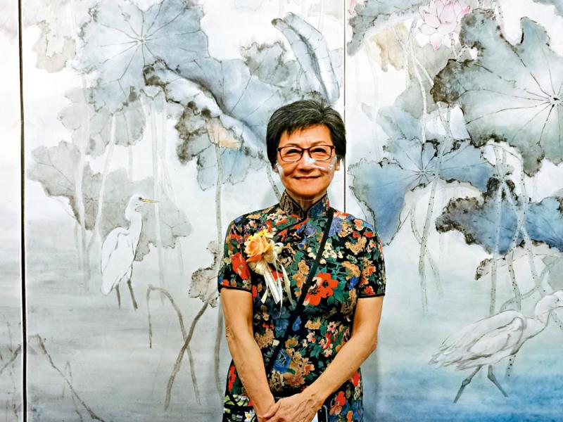 何洵瑤介紹,展品中最喜愛的是大呎幅六條屏作品《荷塘拾趣》,創作及用工都花了許多心思。畫面中荷塘上的白鷺悠游自在,色彩的暈染讓荷塘更多了一份浪漫平和的氣氛。