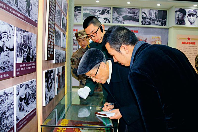 毛浩夫(右一)跟隨爺爺毛秉華(右二)到平江起義第一團收集史料。 大公報攝