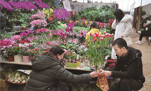 記者在澗西區遼寧路市花卉博覽中心看到,象徵節日喜慶的鮮花擺放在店內最顯眼的位置,不少市民正在選購鮮花。店主忙着給顧客介紹、包裝,有人忙得早飯都顧不上吃。