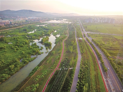 7月30日,俯瞰高新區濱河北路,洛河北岸新建的兩條紅色「樂道」沿河道延伸,與流水、綠地、藍天勾勒出一幅自然和諧的美景,成為市民綠色出行、便民惠民的城市風景線。