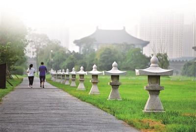 昨日,洛陽市民在隋唐洛陽城國家歷史文化公園天街休閑健身。盎然的綠意、古今交融的美景,讓不久前開放的天街北延項目成為便民惠民的城市風景線。