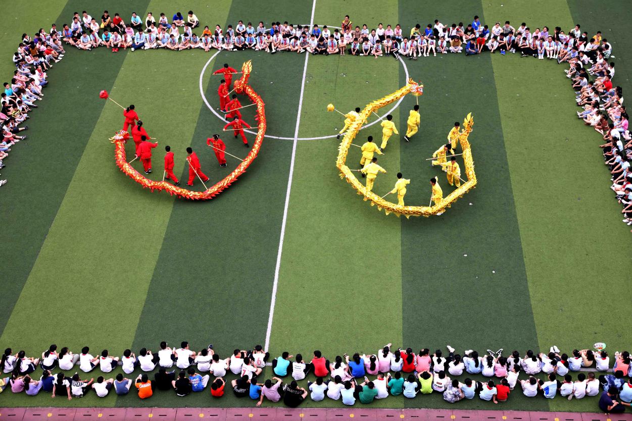 合肥市瑤海區蚌埠路第二小學,學生觀看傳統舞龍表演。