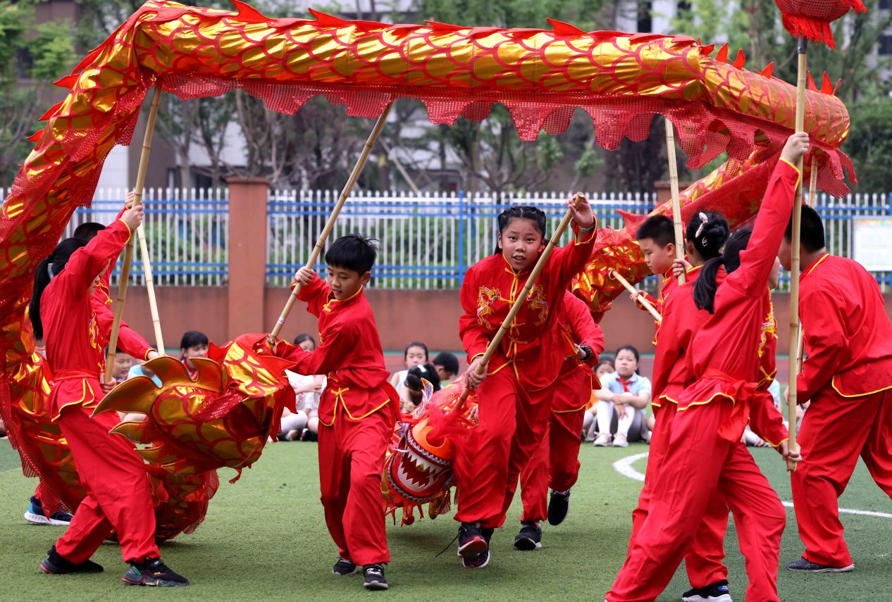 大公網訊(張玲傑 通訊員解琛)端午節將至,安徽省合肥市瑤海區蚌埠路第二小學在校園里舉行傳統舞龍表演活動,小學生們通過舞龍表演,感受中華傳統文化,迎接端午節的到來。