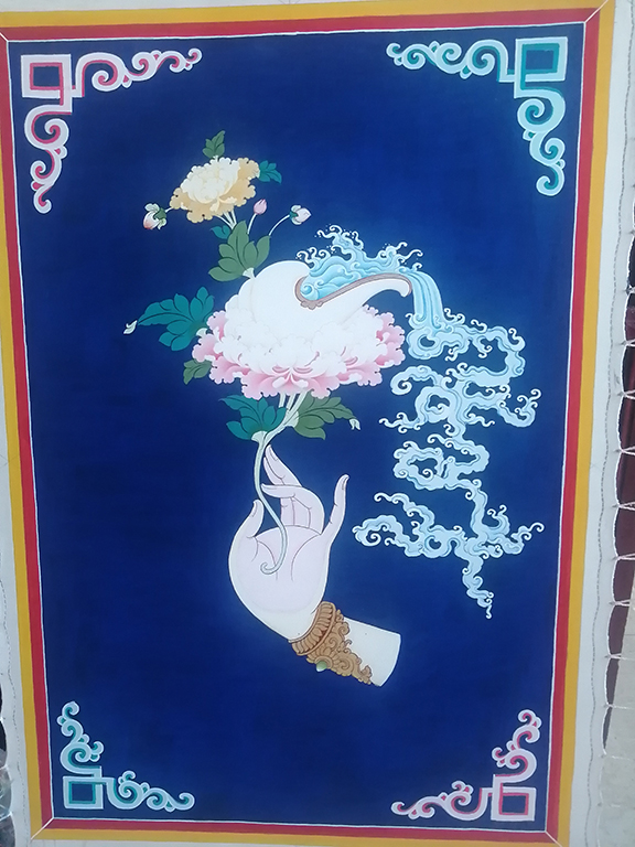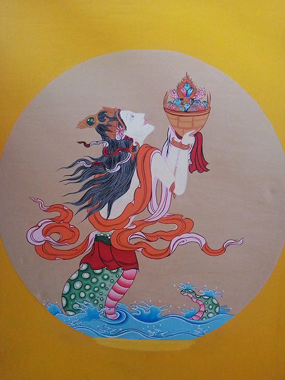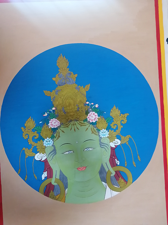 唐卡對材料的要求很嚴,學習畫唐卡先要會製作各種顏料,每個學生的第一課都從研顏料開始。繪製唐卡的傳統顏料包括金、銀、珍珠、瑪瑙、珊瑚、綠松石、孔雀石、硃砂等天然礦物顏料和藏紅花、大黃、藍靛等天然植物顏料,基本顏色是紅黃藍綠白五種,能調製出幾十上百種顏色。着色之後是描金,即用金汁把造像再描一遍。用金是熱貢唐卡的重要特徵之一,描金和最後的幾道工序如鋪金、磨色和開眼都會用到黃金。金色,畫師們稱為冷金黃色。是把成色上好的黃金碾成紙一樣薄的金片,然後把金片切成細細的絲,再加入碾好的石粉和玻璃粉,用圓石頭研磨,同時一點一點加水,最後用清水把糊狀混合物中的石粉和玻璃粉衝涮出來,剩下洗凈的金粉溶液,就是「冷金粉」了。