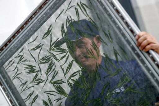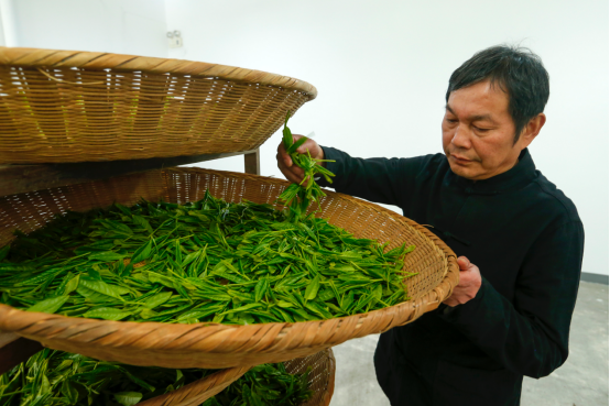 國家級非遺傳承人方繼凡檢查正在攤放的太平猴魁鮮葉。(施亞磊攝)