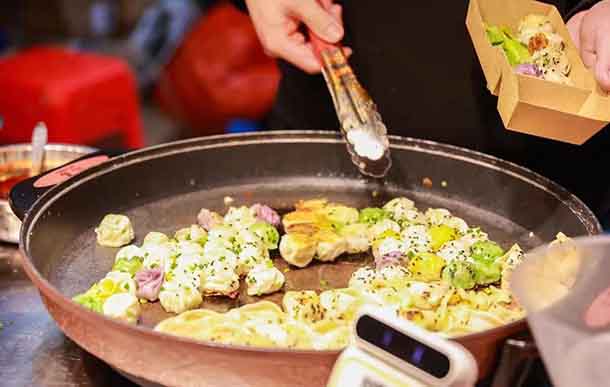 夜幕降臨,街區北側的美食點位香味撲鼻,視覺和嗅覺被瞬間激活,瀰漫於整條街區的食物香氣正在喚醒你的味蕾。一邊自然芬芳,一邊孜然飄香,夜市攤位聚起的璀璨燈光。即便是再挑剔的味蕾,也逃不過襲面的鮮香。鮮花奶茶人酣暢,煙火微醺夜來香。(張玲傑、魏娜、孫雨靜、楊紅艷)