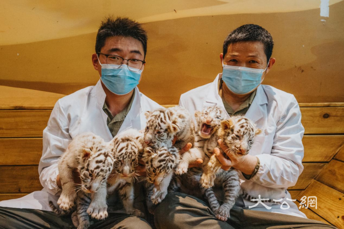 白老虎屬孟加拉虎,通體白色帶褐色條紋,是國家一級重點保護動物,通常一次只能生產1到4隻小老虎,此次,銀基動物王國首次成功繁殖白虎六胞胎,在國內十分罕見。