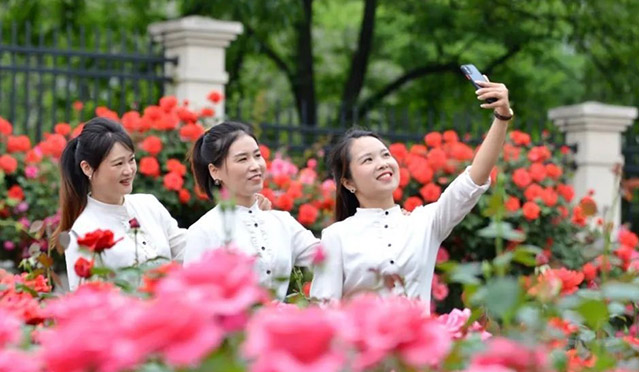 「這裏的月季花太美了,各種顏色都有,比家裡的月季好看多了。我也拍了不少照片,一會兒就發個朋友圈。」正拿着手機拍照的市民劉女士和同伴笑着說。這裏除了大片種植在花圃外,園林部門還採取花境的手法,在圍牆內側種植樹狀造型月季,氣質典雅,賦予園區最美的景色。