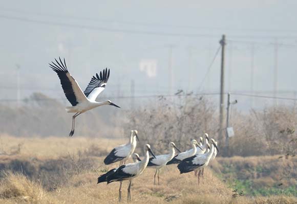 東方白鸛屬大型涉禽,體態優美,是國家一級保護動物,有「鳥界國寶」和濕地生態環境「指示物種」之稱,全球數量不足3000隻。它們喜歡在沼澤、濕地或塘邊涉水覓食,主要以小魚小蝦等為食。
