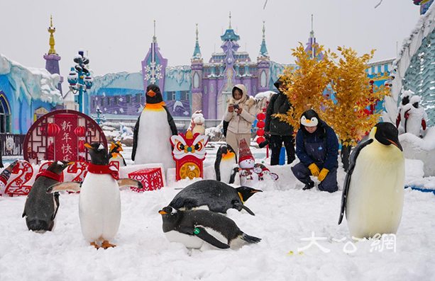 萌萌噠的帝企鵝、巴布亞企鵝圍着紅色新年圍脖,搖搖擺擺地在雪地裏散步,彷彿在進行一場冰雪版的時裝秀,憨態可掬的模樣引得遊客們紛紛駐足觀看,拍照留念。