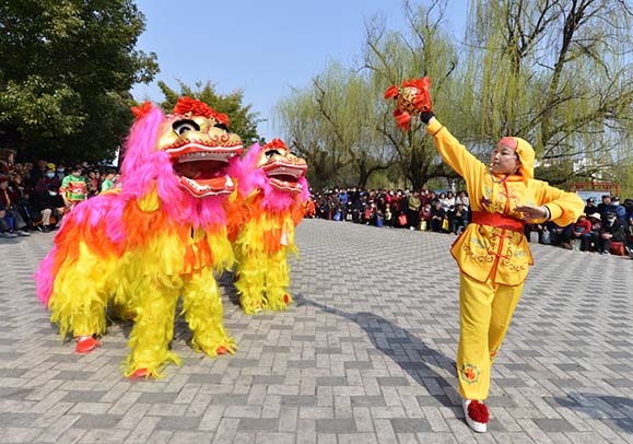 春龍抬首,鴻運當頭。下午2時許,洗耳池公園內鑼鼓喧天,龍獅齊舞,一片歡樂祥和的節日氛圍。伴隨着激昂的鑼鼓聲,舞龍隊的表演首先登場。只見表演者手擎兩條長龍交織穿梭,金龍翻騰飛躍,千姿百態,妙趣橫生,時而騰空躍起,時而擺出不同的造型,令人眼花繚亂。