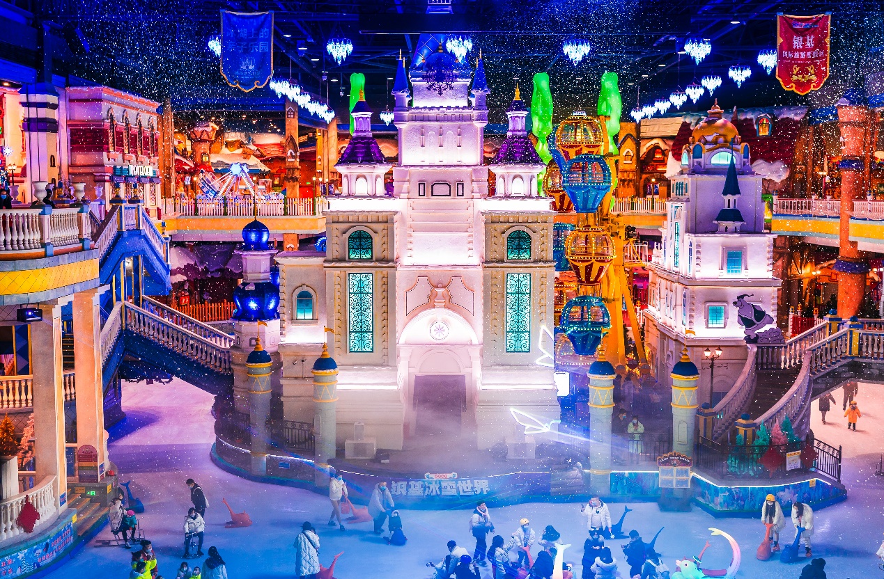 全網熱門打卡地的銀基冰雪世界有着3000㎡的室內冰湖面和豐富的娛雪設施,親子家庭可以感受冰上運動的樂趣,與企鵝家族歡樂互動,輕鬆遛娃,唯美夢幻的飄雪秀、極光秀更讓人彷彿置身於一個童話世界。
