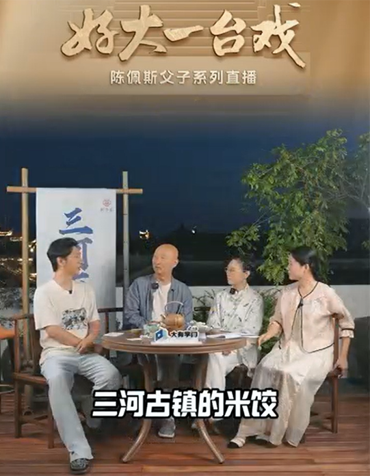 「三河古鎮的米餃、米面、蝦糊很好吃!」5月28日,話劇《驚夢》巡演合肥站預熱直播在安徽省肥西縣三河古鎮開展,藝術名家陳佩斯和兒子陳大愚現身古鎮,與黃梅戲名家吳瓊、知名主持人周群圓桌對談,合唱黃梅戲,並希望更多人愛上肥西縣,愛上三河鎮。