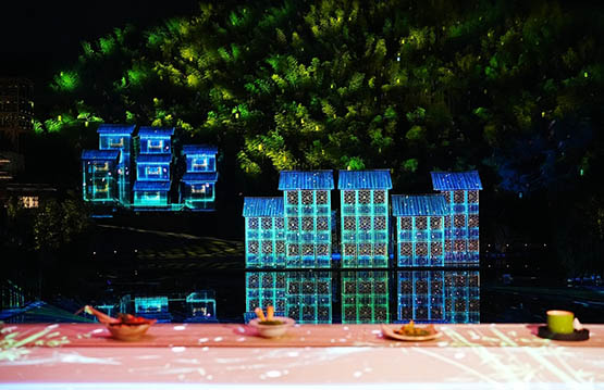 《竹海幻境》是一個被「宴與演」覆蓋了的時空。在這裏,「宴」不僅僅是簡單的幾道菜,一次飯局,它蘊藏着中國人所獨有的儀式感和幸福感。正如李彥所說:「我們嘗試將聚合著中國式情感體驗的宴文化與新媒體藝術結合起來,在科技手段與情感體驗的雙向交融中,將數控裝置藝術、多層次疊影投息、飲台光影互動科技、可移動數控餐桌技術等媒體藝術手段融入到一山、一林、一樓、一燈、一盤之中,通過視、聽、飲、食、嗅等五感編排,讓幻境變得可見、可飲、可感、可敬。」