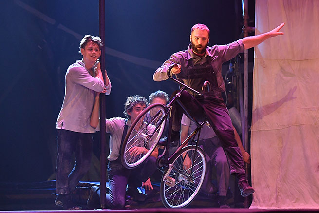 開幕式上,加拿大雜技表演藝術家們帶來劇目《馬戲機器》,該劇中的六位角色各具特色,他們憑藉精湛的技藝,在蹺蹺板、雜耍棍、架子鼓乃至浴巾等各式表演,都能巧妙駕馭,表演既洋溢着詩意,又不失詼諧幽默與風趣,令人嘆為觀止。