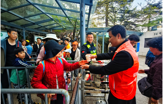 志願者在黃山之巔為遊客送上熱水。黃山市委宣傳部供圖