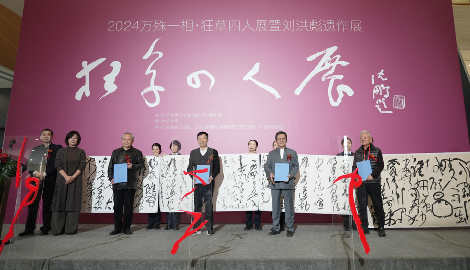 大公網訊(記者 楚長城)11月16日,「2024萬殊一相·狂草四人展」暨劉洪彪遺作展在河南鄭州美術館開幕,以「致敬王鐸,寫意經典」為主旨,展出的胡抗美、張旭光、張學群、王厚祥四位書法家的書法作品,展示狂草藝術的獨特魅力和書法家個人的精神世界,還特別展出劉洪彪的部分遺作,這既是對劉洪彪藝術人生的深情緬懷,也是對傳承和弘揚草書藝術的激勵和啟迪。