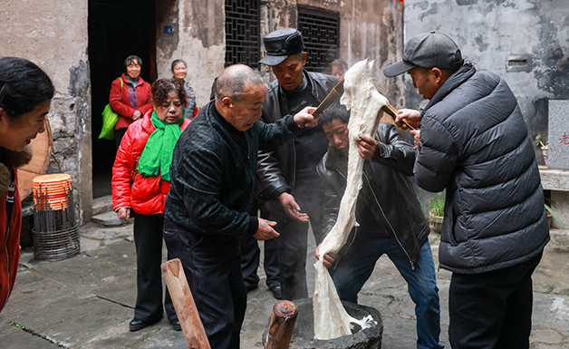 在洪江古商城渠陽會館,打糍粑的場景熱火朝天。壯漢手持木槌,有節奏地捶打着石臼中的糯米團,發出「砰砰」的聲響,糯米變得愈發軟糯,最後被捏成一個個香甜的糍粑,空氣中瀰漫著糯米的香味。孩童們好奇地湊近,伸手觸摸白白胖胖剛成形的糍粑,引得眾人一陣歡笑,形成了一幅幸福和諧的年趣圖,增添了濃濃的年味。