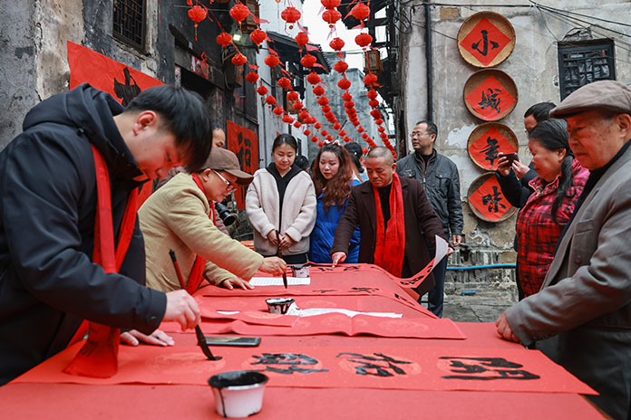 孩童們興奮地幫忙遞刷把和膠水,大人小心翼翼地展開春聯,刷上膠水;商舖也忙碌起來,貼上中意的春聯。「古城笑迎八方客;新宅愉納多路財。」「明珠重鎮,二水流金,七省通衢忙客旅;窨屋豪門,三湘耀彩,千秋勝跡記人文。」一幅幅充滿喜慶與帶有洪江特色的春聯被張貼在門楹上。春聯上鮮艷的紅色格外醒目,紅紅的春聯讓整座古城籠罩在喜慶的氛圍之中。