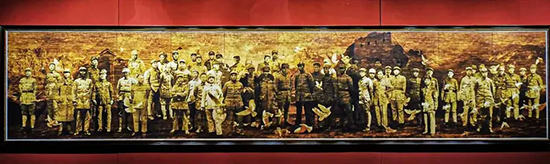 走進展館,首先被《紅色中國·鐵血瀟湘》——湖南近代革命軍事歷史畫卷所震撼。新興版畫巨作由湖南版畫藝術家羅湘科用時三年完成,作品採用了木刻與絲網結合的表現手法,生動而強烈地再現了湖南近代史上,以毛澤東為代表的革命軍事家們的非凡氣質與英雄形象,深刻展現了湖南人「心憂天下,甘灑熱血」,氣吞山河的革命英雄主義氣概。
