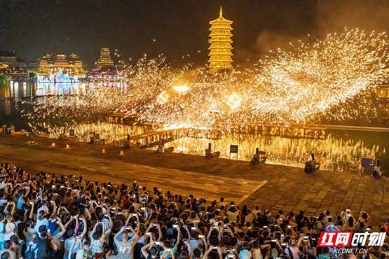 長沙銅官窯國風樂園,遊客欣賞打鐵花表演。