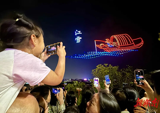 永州市零陵古城景區,1000架無人機在空中變幻出各種炫酷圖案與本地文化創意造型。