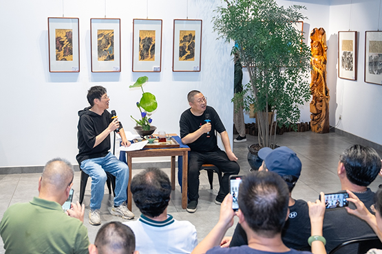 開幕式現場,主持人李兵和藝術家印庵進行了生動的對話。李兵問印庵,你的作品為何總是那麼寧靜、深邃,充滿生命的律動與哲思?「歸心」這個主題寄託了怎樣的創作心境和藝術追求?以及如何看待自己的作品在滋養人心、融入家庭生活方面所扮演的角色?希望觀眾從畫作中得到何種感悟?印庵先生一一回應,現場掌聲雷動。