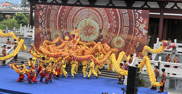 由武岡「板凳龍」「長龍」「鵝頸龍」一起上場的《三龍耀武岡》,將現場氣氛推向了最高潮。板凳龍起源於漢代,在武岡有着悠久的傳承,是人們祈求風調雨順、五穀豐登的一種祭祀形式。通常由三人一組,通過盤旋、翻滾、跳躍、穿梭等動作來模擬龍的形態和動作,是每年的農曆新年、元宵節以及六月初六「嘗新」等重要節日及活動的民俗表演。鵝頸龍屬於民間龍燈的一種,因龍頸修長如鵝頸而得名,2023年被列入邵陽市非物質文化遺產名錄。此次出場的鵝頸龍,身長69米,與武岡六九福地的美譽完美契合。
