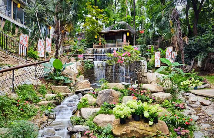 作為長沙最早的生態公園,1965年落成的南郊公園以200餘株原生喬木的蔥蘢綠意,為嘻院鋪展開天然的背景畫幅。推開仿古木門,青石板路蜿蜒穿過錦鯉躍水的池塘,古箏雅樂與流水聲交織,重現江南園林的雅緻意境。
