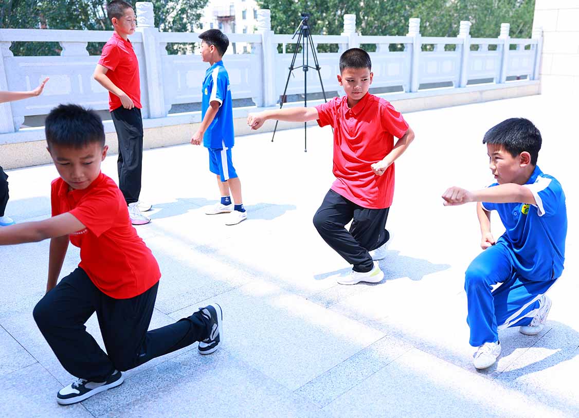 在武術交流互動環節。營員們分組學習五步拳。儘管天氣炎熱,但學員們熱情高漲,一招一式學得格外認真。