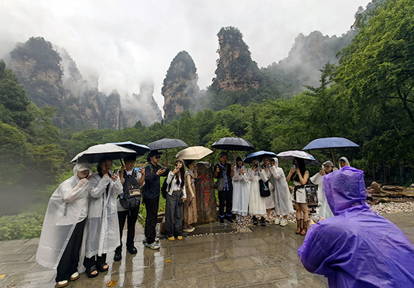 張家界國家森林公園作為世界自然遺產、世界地質公園所在地,以「三千奇峰」聞名全球。本次活動中,重慶網絡達人們冒着綿綿細雨深入黃石寨、金鞭溪、袁家界、天子山等景區,親身體驗平均氣溫23℃的森林氧吧,展現「天然空調」的舒適魅力;探訪摘星台、金鞭岩、乾坤柱、御筆峰等「十大絕景」,用鏡頭捕捉全球獨有的張家界地貌磅礴氣勢與靈秀之美。