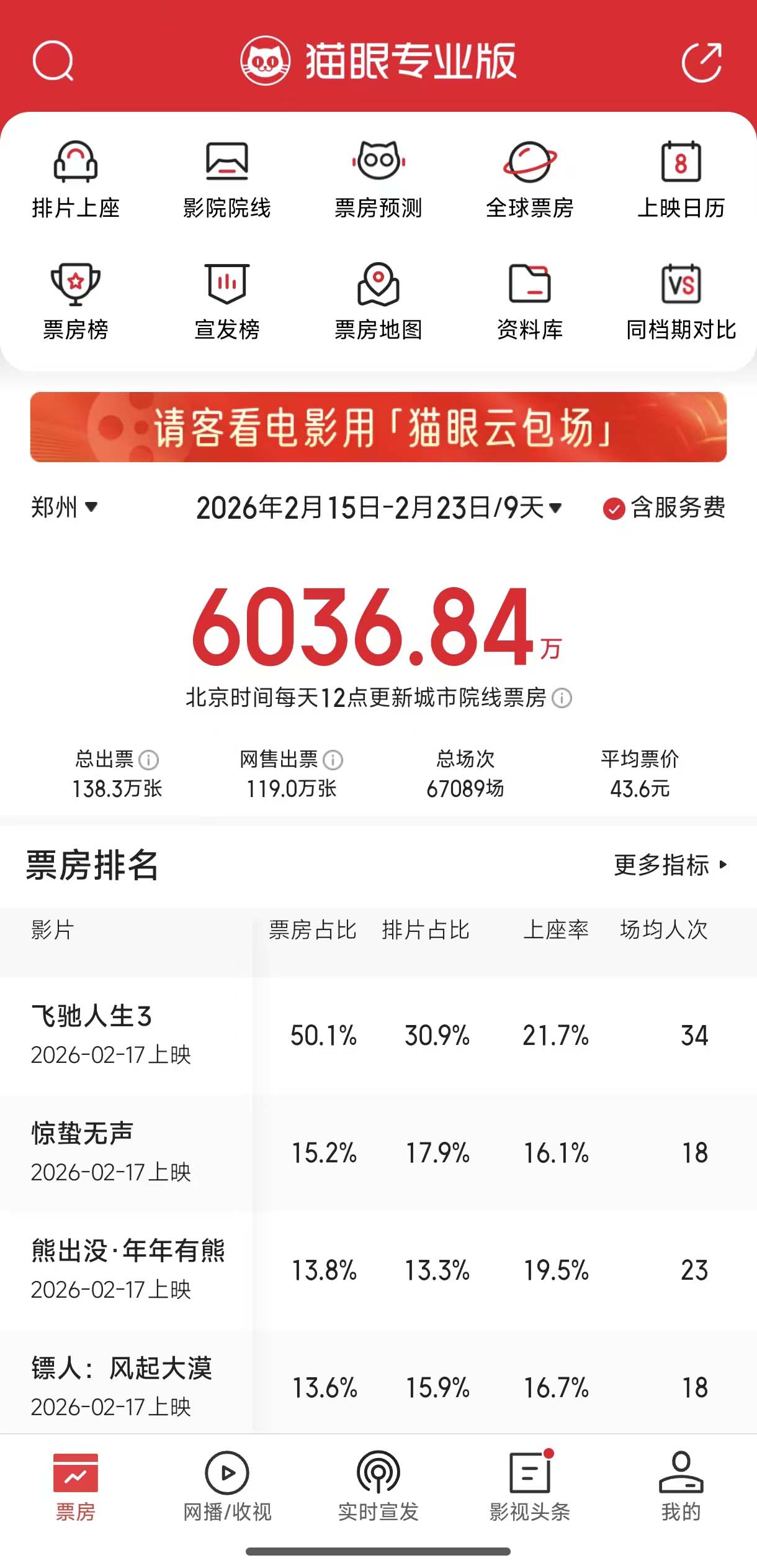 依托「电影+」消费试点政策与「票根经济」的创新实践,郑州2026年春节档电影市场交出亮眼成绩单。据网络平台数据,2月15日至23日,郑州春节档总票房达6036.8万元,占河南省总票房的17.7%,位居全省第一;在全国城市(不含直辖市)票房排名中跻身前10强。