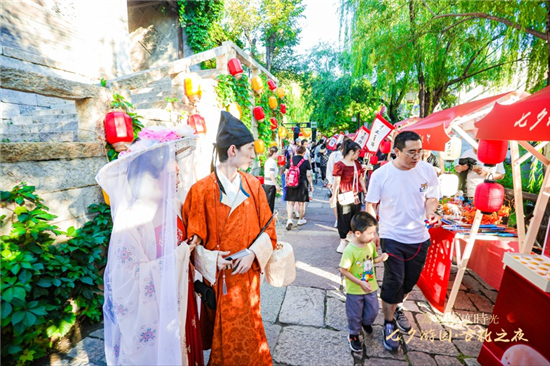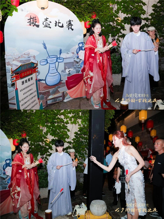 現場從視覺風格到主題活動,到處瀰漫著古風元素,給整場活動增添了濃郁的古韻風味。「這是我第四次來到古北水鎮,也是第一次在七夕和男朋友一起來。我覺得最吸引我的是整個夜晚國潮氛圍,有一種很復古的感覺,最喜歡的是書法體驗,很有沉浸感。」來自北京的劉女士在接受採訪時表示。