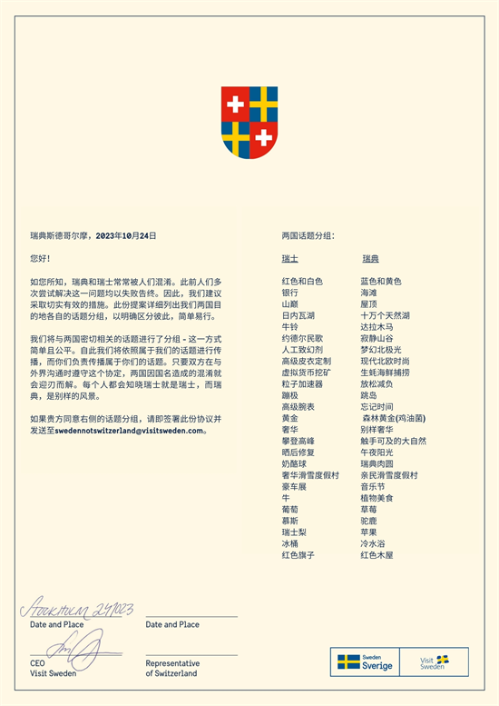 為了徹底終結這一長期以來的困擾,瑞典國家旅遊局終於決定出手了!今天,瑞典向它的同姓但不同宗的「好兄弟」- 瑞士,正式遞交一份提案,明確了25項話題分組,希望自此分工明確,根據各自所長,各顯其能。
