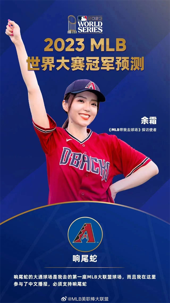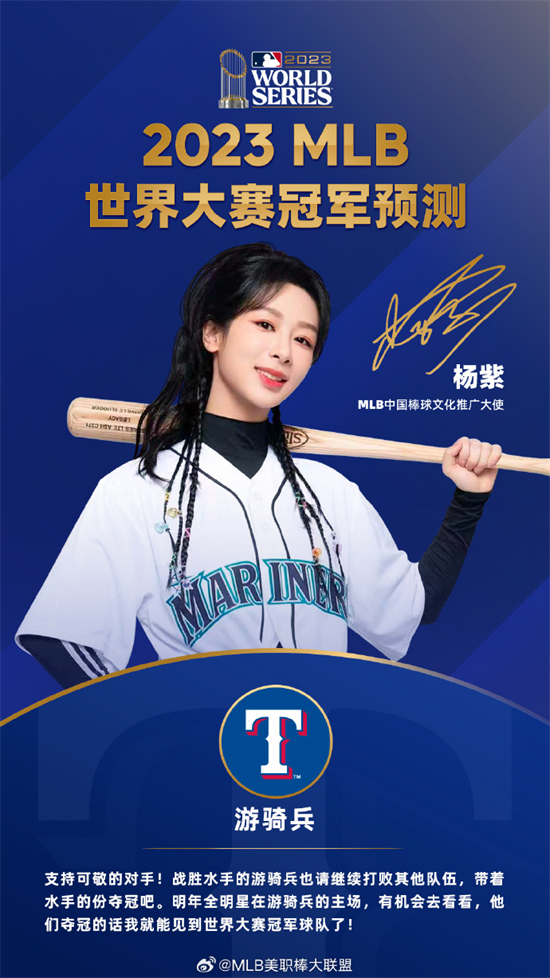 MLB 2023季後賽拉開帷幕之際,MLB便開展了一場激動人心的冠軍預測活動,楊紫、艾熱、馀霜等眾多明星達人踴躍參與,加入了這場預測的行列。歷經季後賽的重重廝殺後,德州遊騎兵、亞利桑那響尾蛇突出重圍,拿下世界大賽門票。開賽在即,究竟是楊紫看好的德州遊騎兵會摘取桂冠,還是亞利桑那響尾蛇最終登頂,讓我們拭目以待。