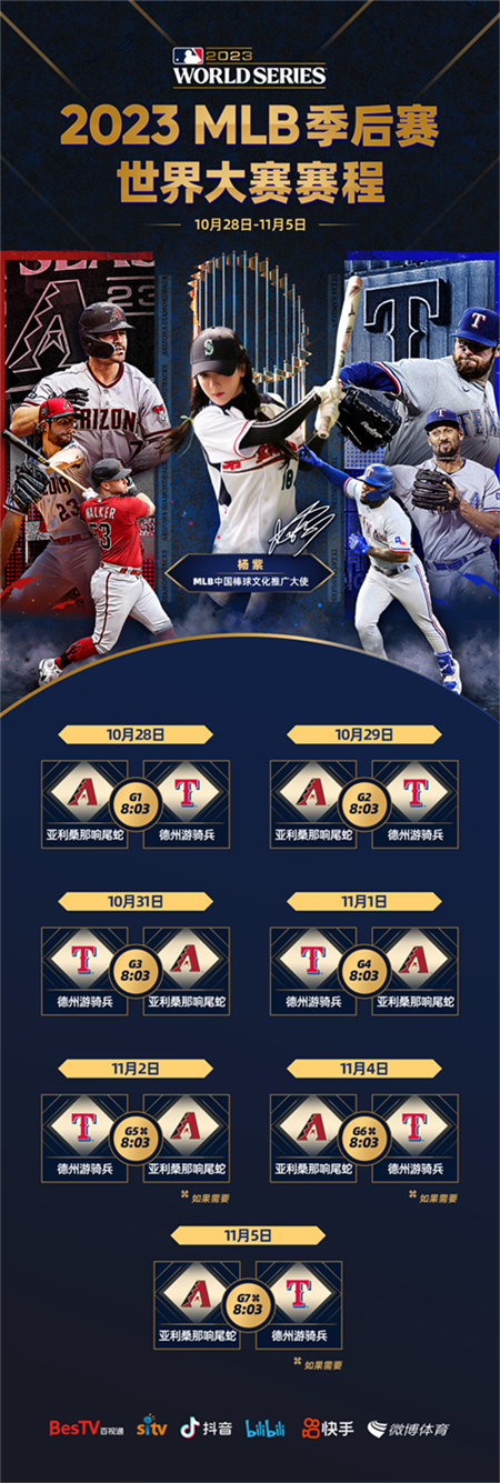 為了讓國內的棒球粉絲們也能領略到這一殿堂級的巔峰競技,MLB美職棒大聯盟與百視通IPTV將共同為球迷提供賽事全方位大屏直播,同時攜手抖音、B站、快手、微博四個數字平台組成季後賽直播陣營,同步直播2023 MLB世界大賽。作為MLB中國棒球文化推廣大使,演員楊紫也將與廣大球迷粉絲共同見證世界大賽冠軍的誕生。