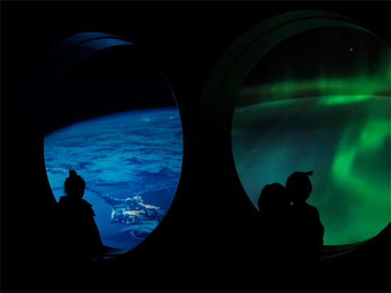 在重磅展項《天宮之境》中,首創巨型球體投影加聲畫一體沉浸式體驗。以空間站實拍影像資料為基礎,以航天員的獨特視角,展現了種種地球奇觀:日冕與晨昏線、太平洋風暴眼、海洋與洲陸、極光與閃電……每位觀眾在此都能身臨其境,一覽地球的光陰律動。