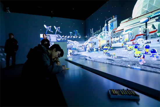 多媒體互動項目《太空基地》板塊,是參照中國未來的月球太空基地樣式進行設計的交互體驗區,小觀眾們可以通過投影牆壁與自己塗色設計的航天員、飛行器進行互動,在數字空間裏感受未來航天。