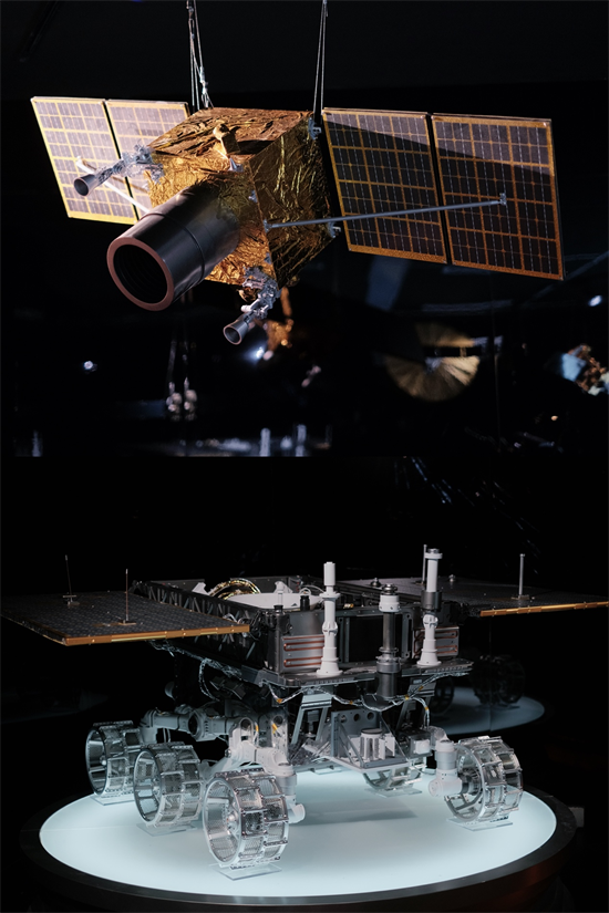 實物模型展項《來自祖先的命名》板塊,不僅有從太空歸來的實踐十號衛星返回艙實物、玉兔號、祝融號高精模型,更有20餘組航天器集中展示。